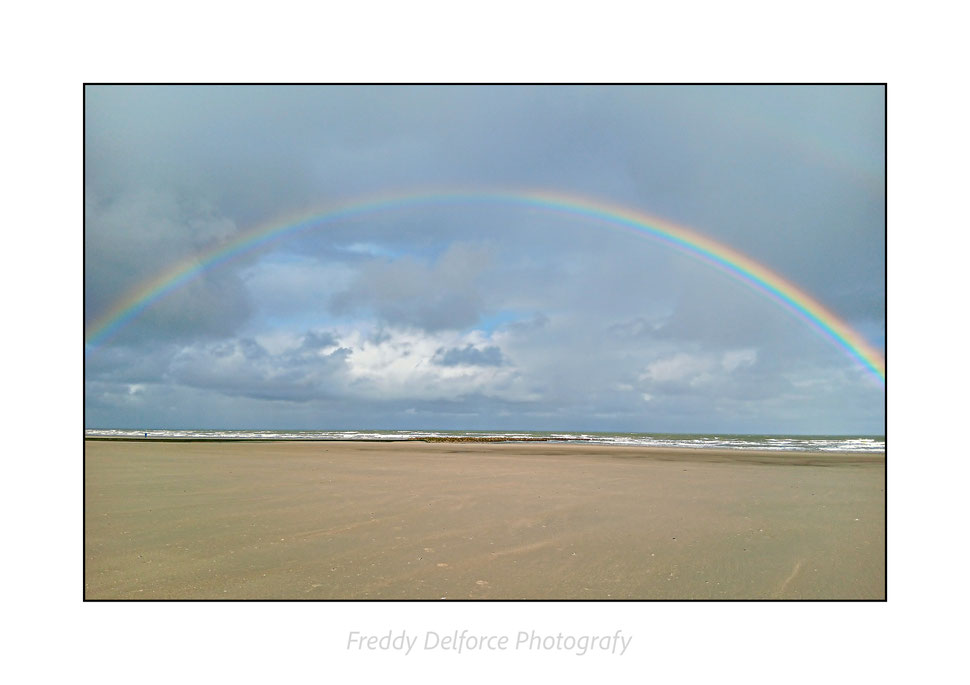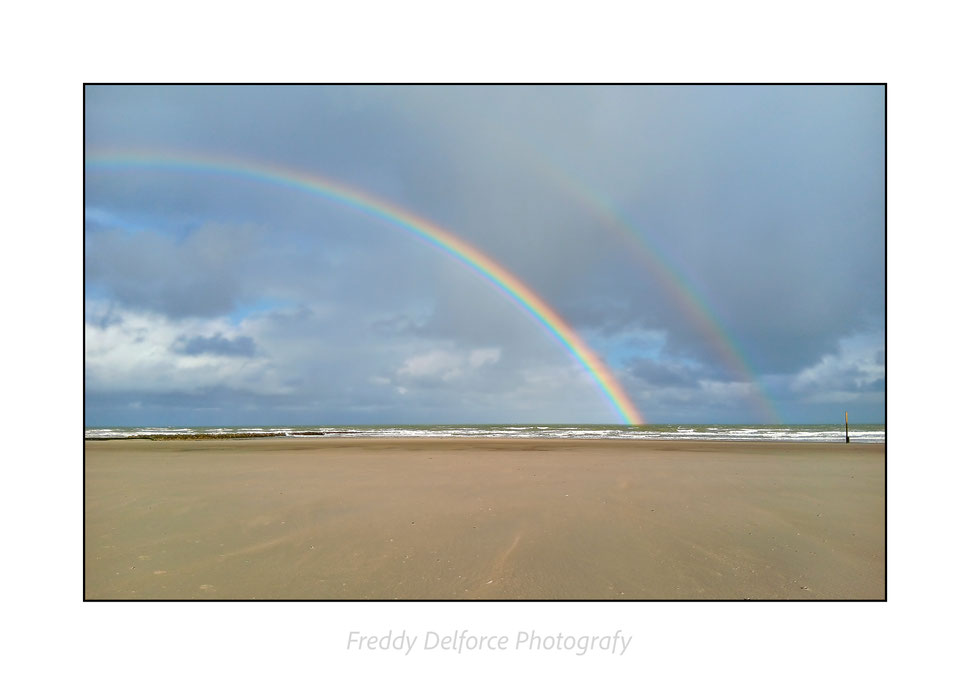 Tijdens de morgenwandeling op het strand van Bredene was er opeens een dubbele regenboog te zien. Op de foto hieronder was er terug een normale regenboog.